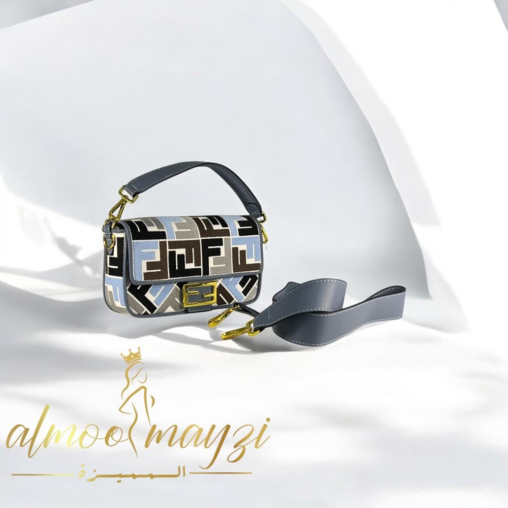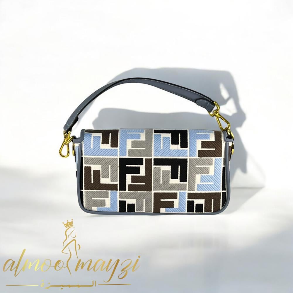 حقيبة يد أنيقة بنمط عصري يدمج بين الألوان المتناسقة مثل الأزرق الفاتح، البيج، والأسود.