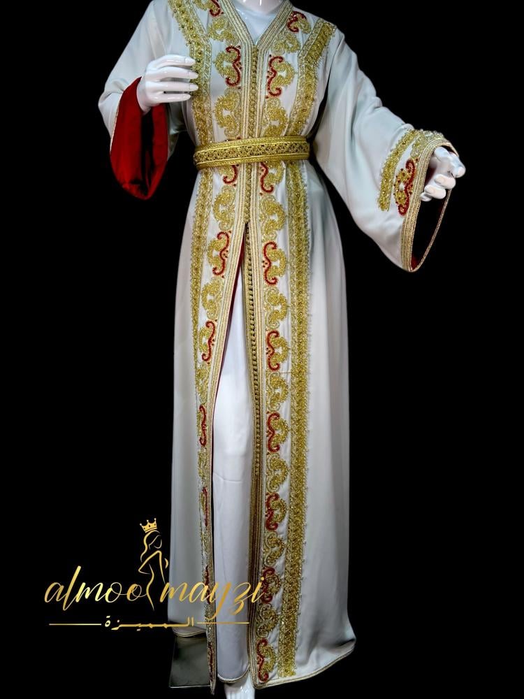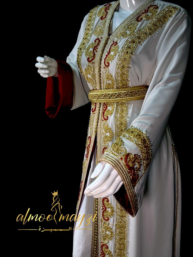 تكشيطة الفخامة الذهبية هي قطعة استثنائية تأسر الأنظار بجمال تفاصيلها وأناقتها الملكية. مصنوعة من قماش فاخر باللون الأبيض الحريري مع تطريزات ذهبية وحمراء دقيقة ومبهرة. التفاصيل المطرزة باليد تضيف لمسة من الرقي والتميز. الحزام العريض المطرز بدقة يعزز جمال القوام ويضفي لمسة أنثوية ملكية. الأكمام الواسعة المزينة بنفس النقوش تعكس روح الأصالة المغربية مع لمسات عصرية.