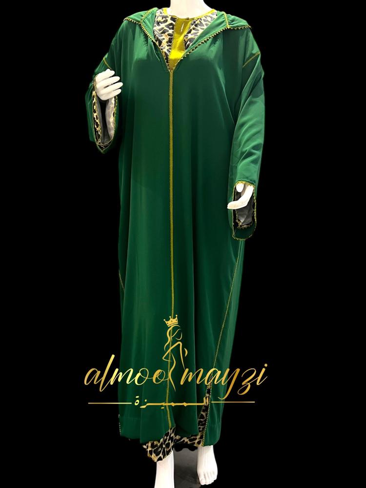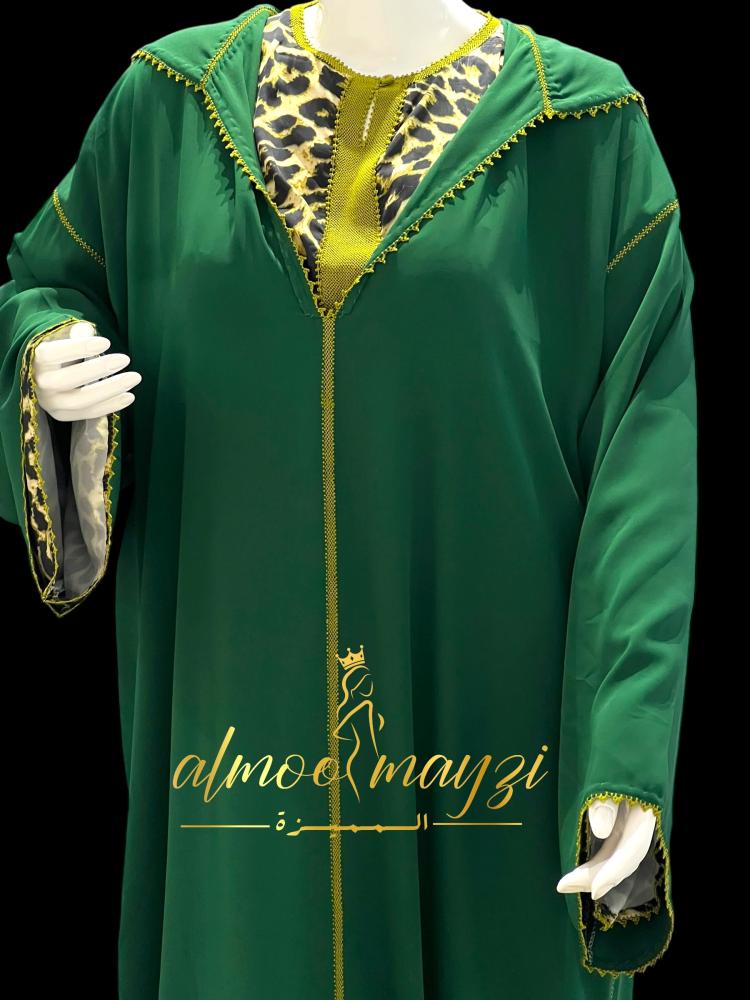 تتميز هذه الجلابة بتصميم عصري يمزج بين الأصالة المغربية ولمسة من الجرأة العصرية، مما يجعلها قطعة فريدة وجذابة. يبرز اللون الأخضر الزمردي الغني كقاعدة، وتتخلله تفاصيل جريئة بطبعة جلد النمر ولمسات ذهبية.